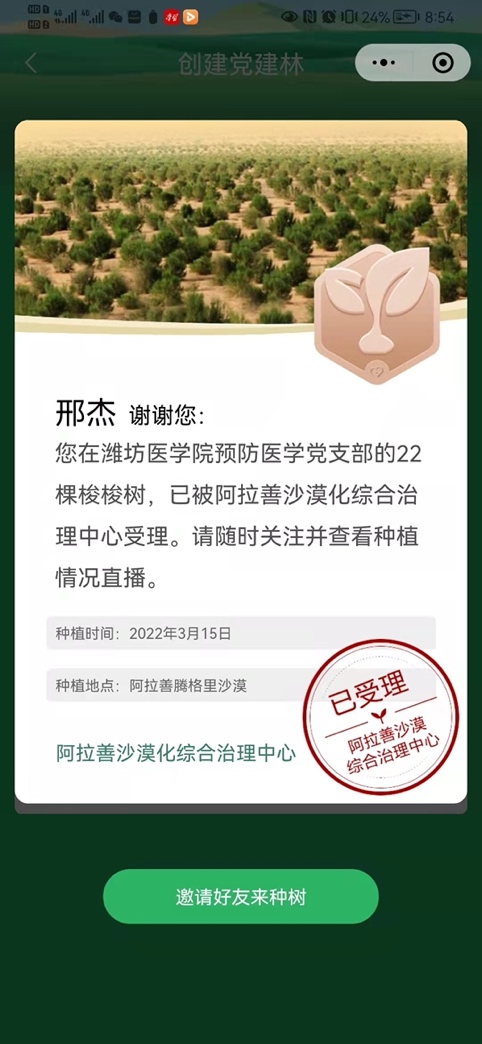 疫情防控时期,预防医学党支部党员同志们虽然只能线上参与,但是仍抵挡不住为绿色家园建设贡献力量的热情。通过云平台在线上创建阿拉善地区支部党建林,党员以集体和个人名义共捐赠29棵梭梭树。