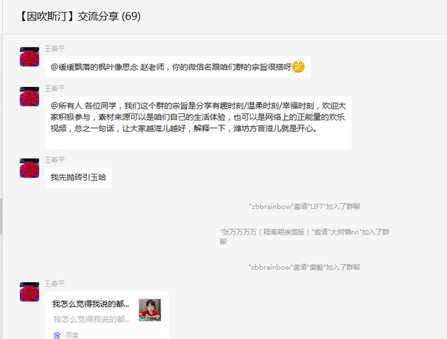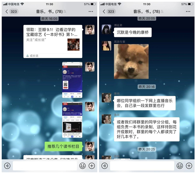 每个小组配备专业指导老师3-4名,建立微信群,根据小组活动主题进行了别出心裁的命名,比如说[因吹斯汀]交流分享、正青春,何惧焦虑、进军影视圈、享受美食-感悟人生等。这种新颖的帮扶形式得到了同学们的喜欢,现在每个群里都有超过60名学生参与。各位指导老师认真准备素材,分享人生经验,读书感悟等,也要求学生们积极参与分享和打卡,每个群里都是热闹非凡。