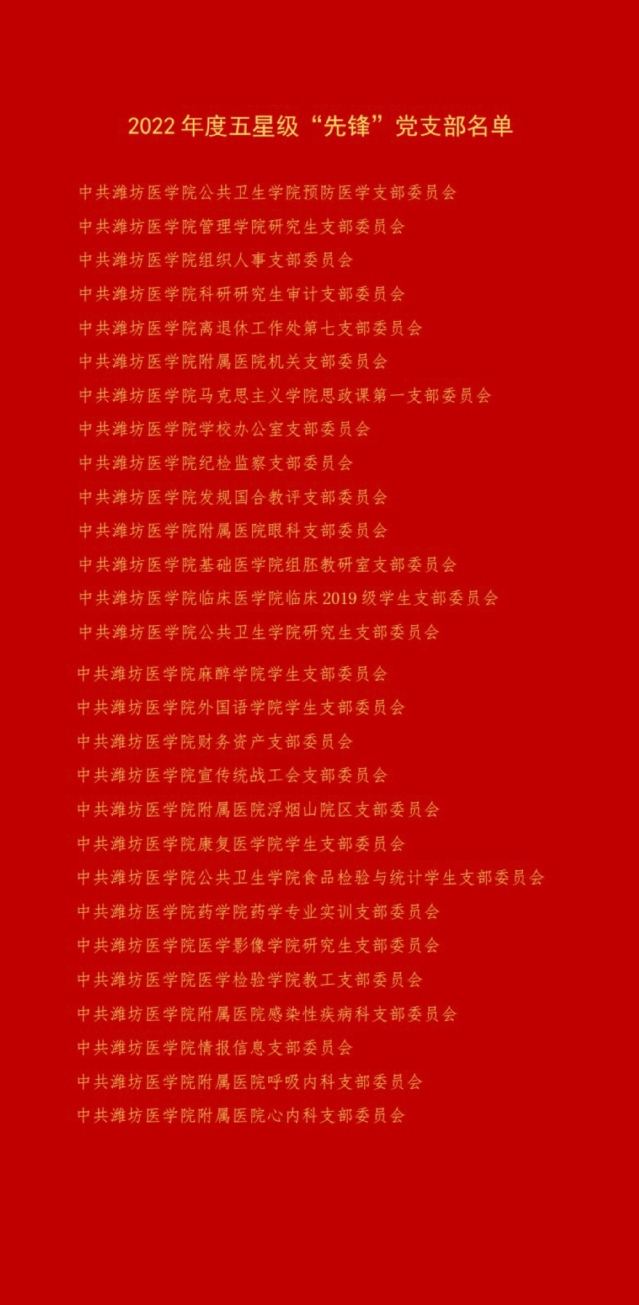 日前,中共潍坊市委教育工委印发《关于命名五星级“先锋”党支部的通报》,经党支部自评、基层党委考评和市委教育工委复核,决定命名153个党支部为2022年度五星级“先锋”党支部,公共卫生学院预防医学党支部位列其中。
