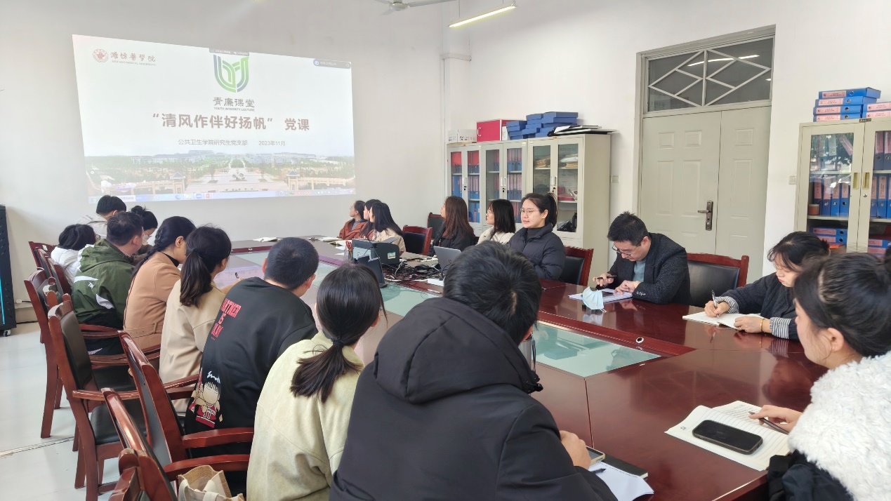 11月8日,公共卫生学院研究生党支部在科技楼B123会议室开展“青廉课堂”主题活动,支部所有党员参加。